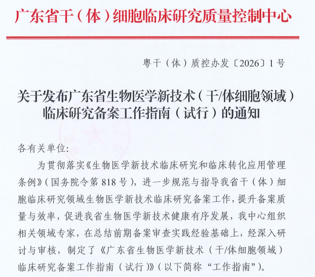 2026年2月-关于发布广东省生物医学新技术(干-体细胞领域)临床研究备案工作指南(试行)的通知