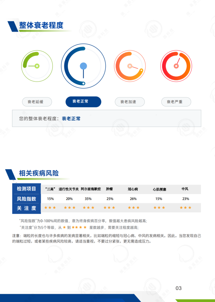3.本页内容不构成对任何疾病的诊断、治疗或疗效承诺,也不能替代医师面对面诊疗意见。检测结果受个体差异、样本质量、实验流程、算法模型与生活方式等多因素影响,属于统计学与健康管理意义的参考信息。任何健康决策应结合个人病史、体检/临床检查结果及专业医师建议综合判断。