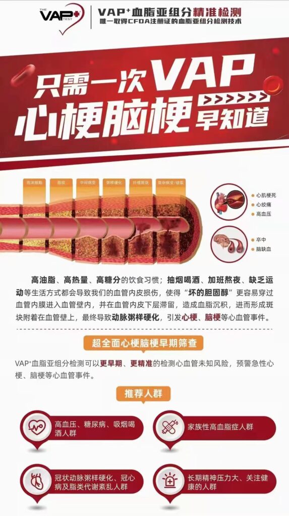 公司重点建设VAP心血管疾病检测技术中心,引进国际先进的VAP+血脂亚组分检测体系。该技术通过精确检测低密度脂蛋白颗粒数量(LDL-P)、脂蛋白残粒(RLP)及LDL密度模式等关键指标,可识别传统血脂检测无法发现的“剩余心血管风险”,帮助临床医生更准确评估动脉粥样硬化及心血管疾病风险,实现早期预警与个体化干预。